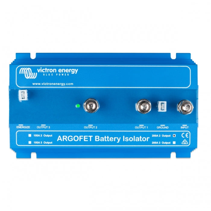 Victron Energy's Argofet isolators allow simultaneous charging of two or more batteries from one alternator or a single output battery charger without connecting the batteries together. Unlike Victron's Argodiode battery isolators, Argofet isolators have virtually no voltage loss. Voltage drop is less than 0.02 volts at low current and averages 0.1 volts at higher currents.