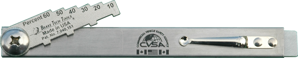 AN ALL IN ONE STAINLESS STEEL, LASER ENGRAVED TOOL THAT HAS A SOAPSTONE HOLDER, SOAPSTONE, RULER, AND PERCENTAGE INDICATOR FOR BRAKE LINING